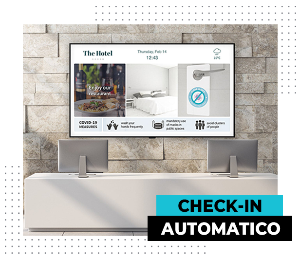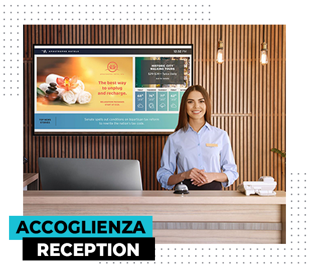 Sempre presente alle spalle dello staff, il Digital Signage darà il benvenuto agli ospiti con le migliori recensioni dell’hotel, le varie tipologie di camere e i pacchetti relax.
